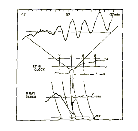 Upper (c): Acoustic-gravity wave trace recorded at same location, showing high amplitude infrasound trace spanning period from 2055 to 2107 GMT, 28 January 1977. Dotted completion of pressure peaks was necessitated where pen encountered edge of chart during the period of rapid pressure rise. (Trace courtesy Cornell's Neurobiological Behavior Laboratory.)