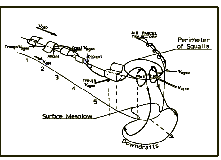 A schematic of the helical motion of air parcels imposed by the radiation of mesoscale atmospheric gravity waves originating from a rotating cluster of snowsqualls. As the parcels approach the mesolow (L in Figure 6), progressively stronger ageostrophic