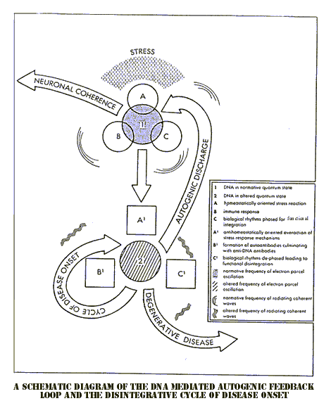 See enlarged legend below 1 DNA in normative quantum state 2 DNA in altered quantum state A homeostatically-oriented stress reaction B immune response C biological rhythms phased for functional integration A1 antihomeostatically-oriented overaction of stress response mechanisms B1 formation of autoantibodies culminating with anti-DNA antibodies C1 biological rhythms de-phased leading to functional disintegration dots normative frequency of electron parcel oscillation hashmarks altered frequency of electron parcel oscillation c-waves normative frequency of radiating coherent waves s-waves altered frequency of radiating coherent waves